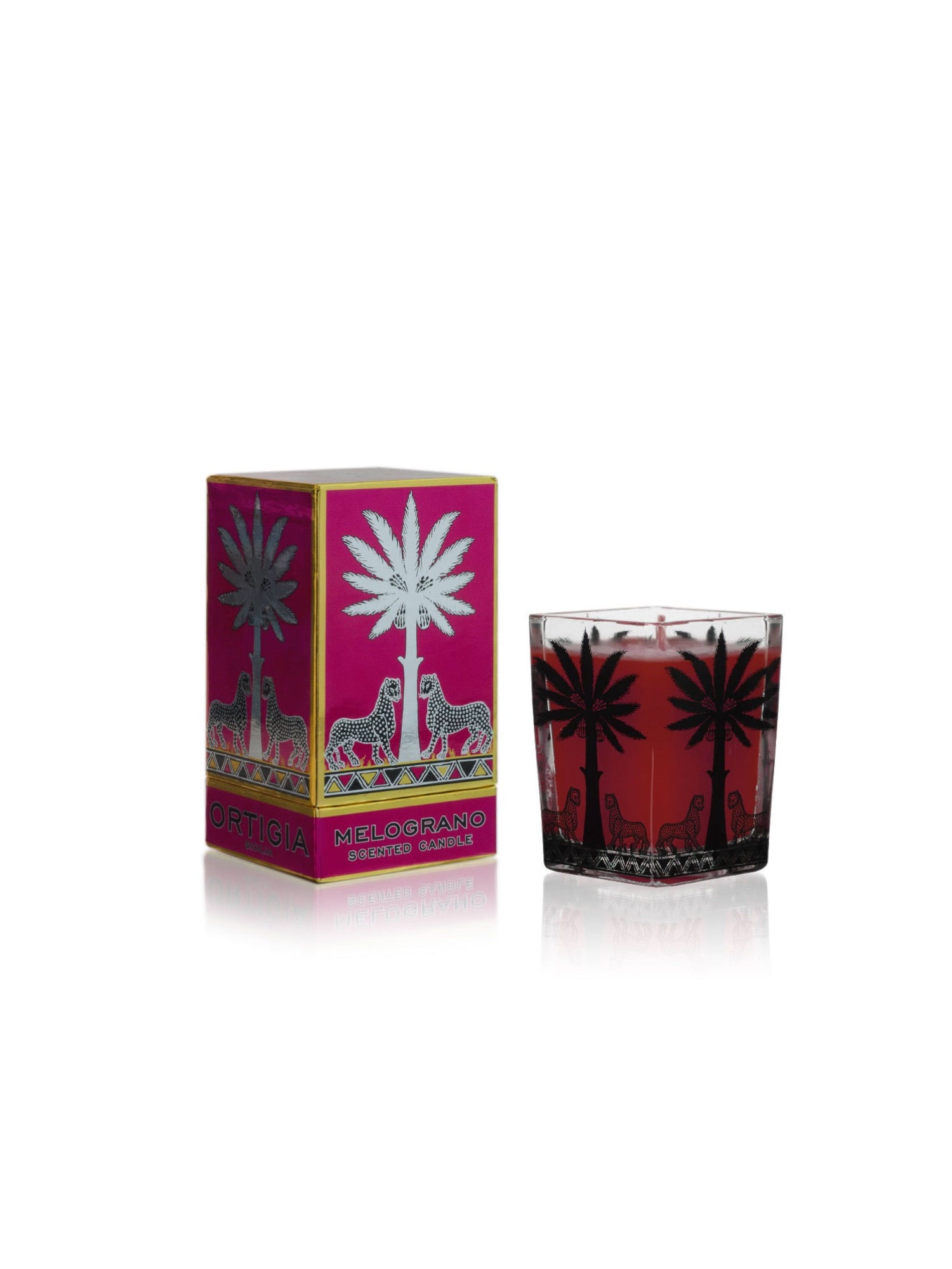 Melograno doftljus palma, med sitt rubinröda vax, är handgjord med omsorg och precision. Doftljuset utgörs helt av naturliga ingredienser, lokalt hämtade från den vackra ön Sicilien. Den intrikata leopard - och palmdesignen som pryder den vackra kvadratiska glasbehållaren ger doftljuset dess elegans - och det är här lyx och sensorisk njutning möts.